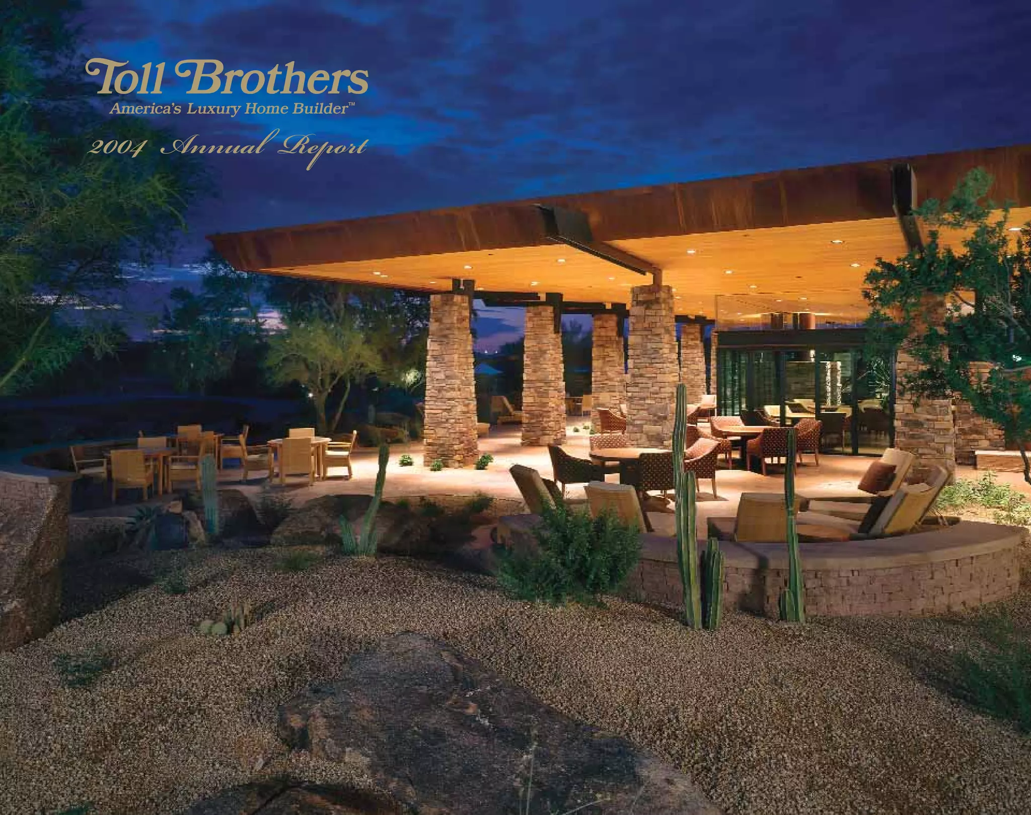 This 2004 annual report summarizes Toll Brothers' excellent financial performance in fiscal year 2004, with record levels of net income, revenues, sales contracts, and backlog. It also outlines Toll Brothers' strategy of focusing on the luxury home market, its strong national land position, and growth opportunities. The report expresses confidence that demand for luxury homes will remain strong due to favorable demographic trends, and that Toll Brothers is well positioned for continued growth and market share gains.