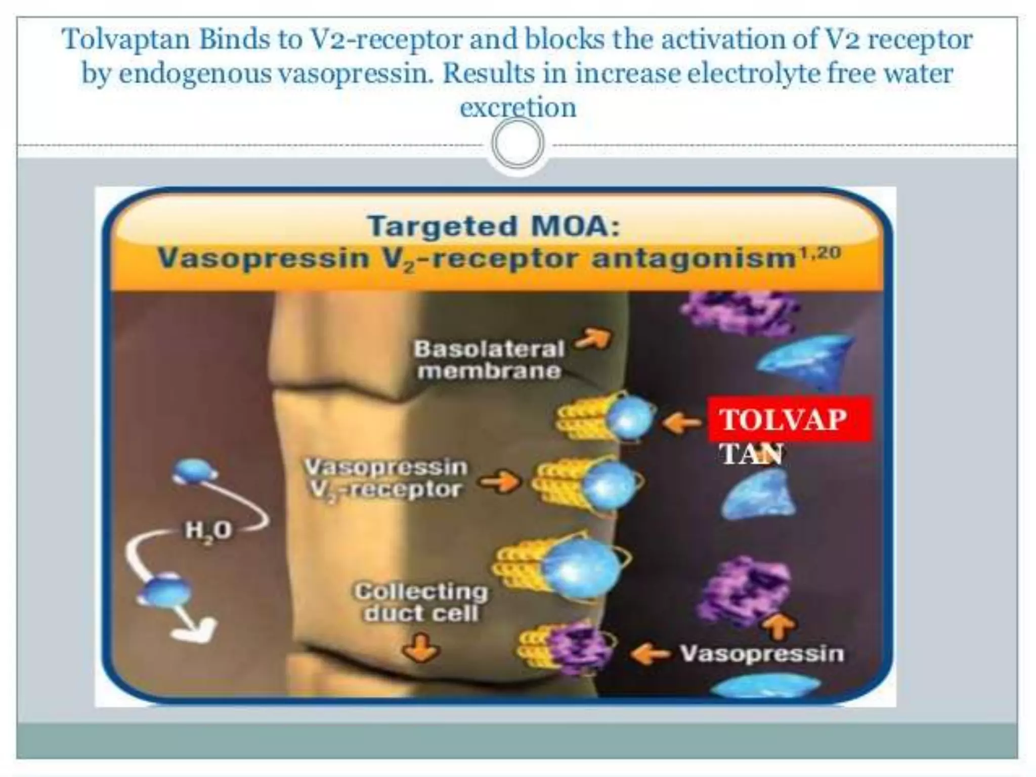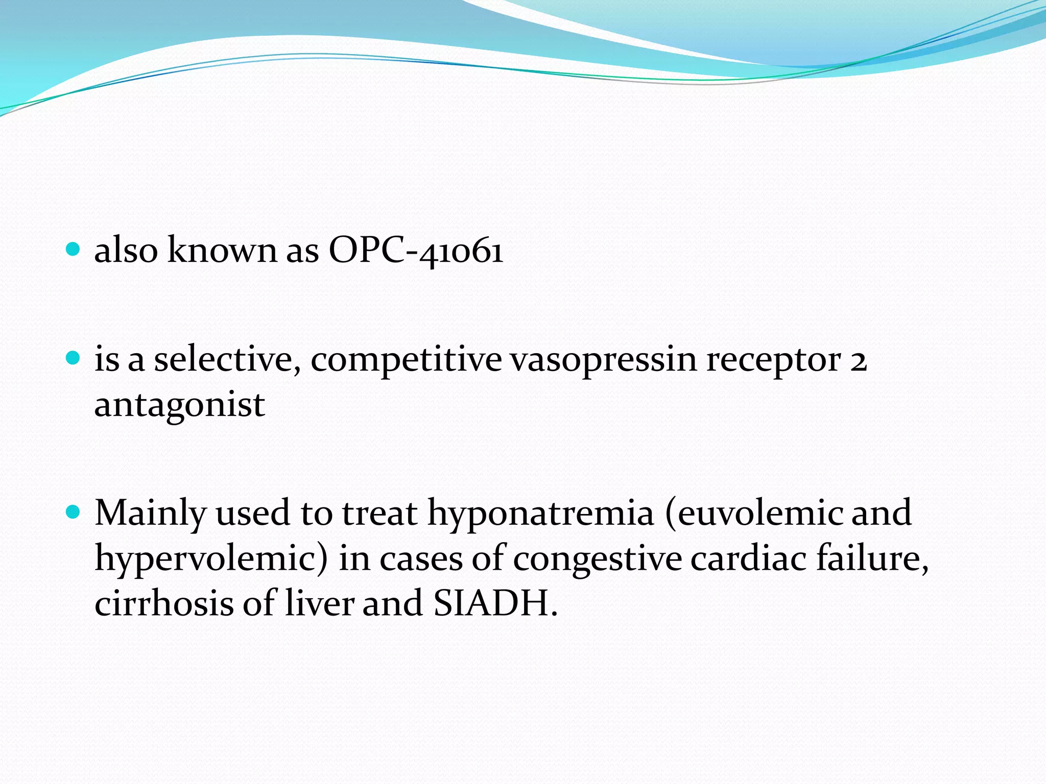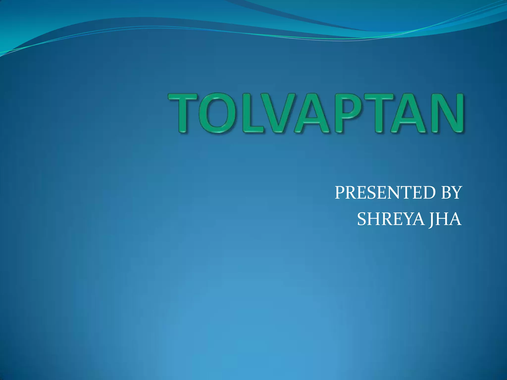 Tolvaptan is a selective vasopressin V2 receptor antagonist used to treat hyponatremia. It works by blocking V2 receptors in the kidney collecting ducts, decreasing water reabsorption and increasing excretion to raise serum sodium levels. Tolvaptan is approved by the FDA to treat hyponatremia caused by congestive heart failure, cirrhosis, or SIADH. It has few side effects but can cause thirst, dry mouth, and polyuria. Care must be taken to avoid overly rapid correction of sodium levels which can cause serious neurological issues.