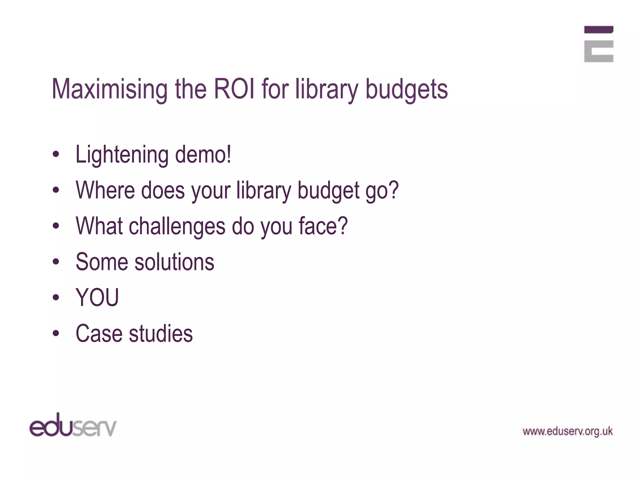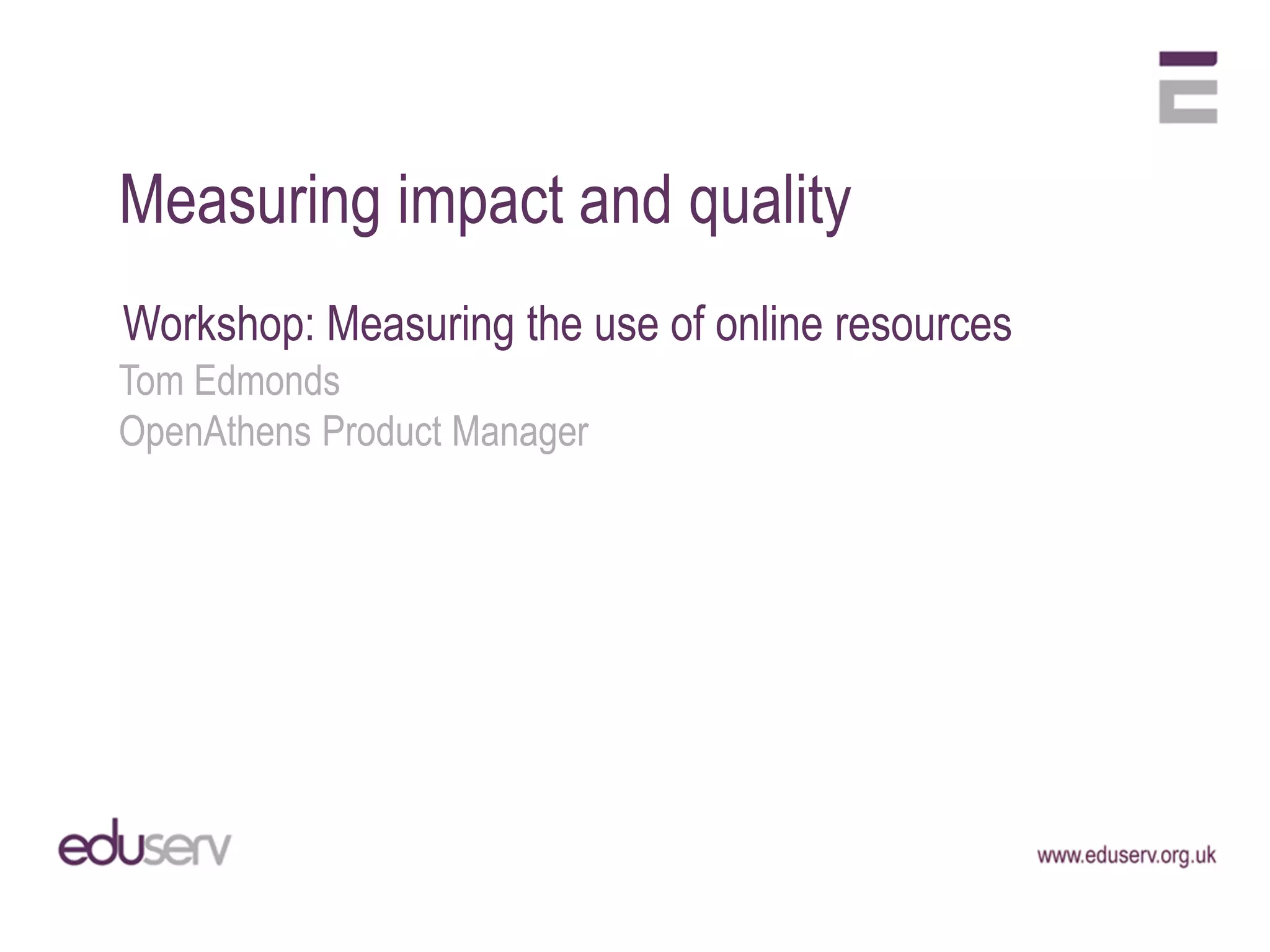 This document summarizes a presentation about measuring the impact and quality of online resources for libraries. It discusses challenges libraries face related to budgets, suppliers, technologies, politics, usability, and users. Two case studies are presented: a small UK higher education institution that implemented a local authentication solution to reduce administration burden and increase electronic resource use, and a commercial research library that renegotiated subscriptions, implemented identity management, and saw increased downloads and reduced costs per download. The presentation emphasizes negotiating with suppliers, using technology solutions, understanding user environment and behavior, and using traditional and social media to market libraries.