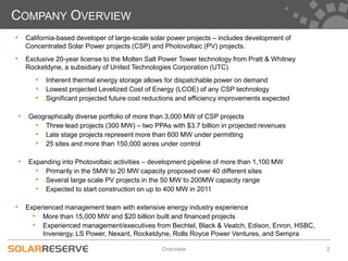 SolarReserve is a California-based developer of large-scale solar power projects, including concentrated solar power (CSP) and photovoltaic (PV) projects. It has a portfolio of over 3,000 MW of CSP projects and 1,100 MW of PV projects in development. Its lead projects include the 300 MW Tonopah, Cinco Casas, and Rice CSP projects, which have secured land, permits, and power purchase agreements projected to generate over $3.7 billion in revenues. SolarReserve's molten salt power tower technology provides thermal energy storage, allowing for dispatchable solar power production up to 24 hours a day.