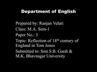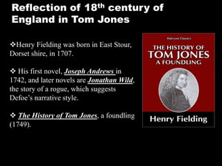 Henry Fielding's novel Tom Jones reflects 18th century English society. It depicts the lives of the middle class, exposing both their virtues and corruption. While the characters and stories are drawn from everyday life rather than mythology or history, Fielding provides social satire and commentary on class structure. As a foundling raised by a wealthy landowner but of low birth, Tom Jones faces opposition in his love for the daughter of a neighbor due to his status, mirroring social issues of the time. The novel offers a realistic portrayal of 18th century urban life, touching on themes of morality, religion, and class.