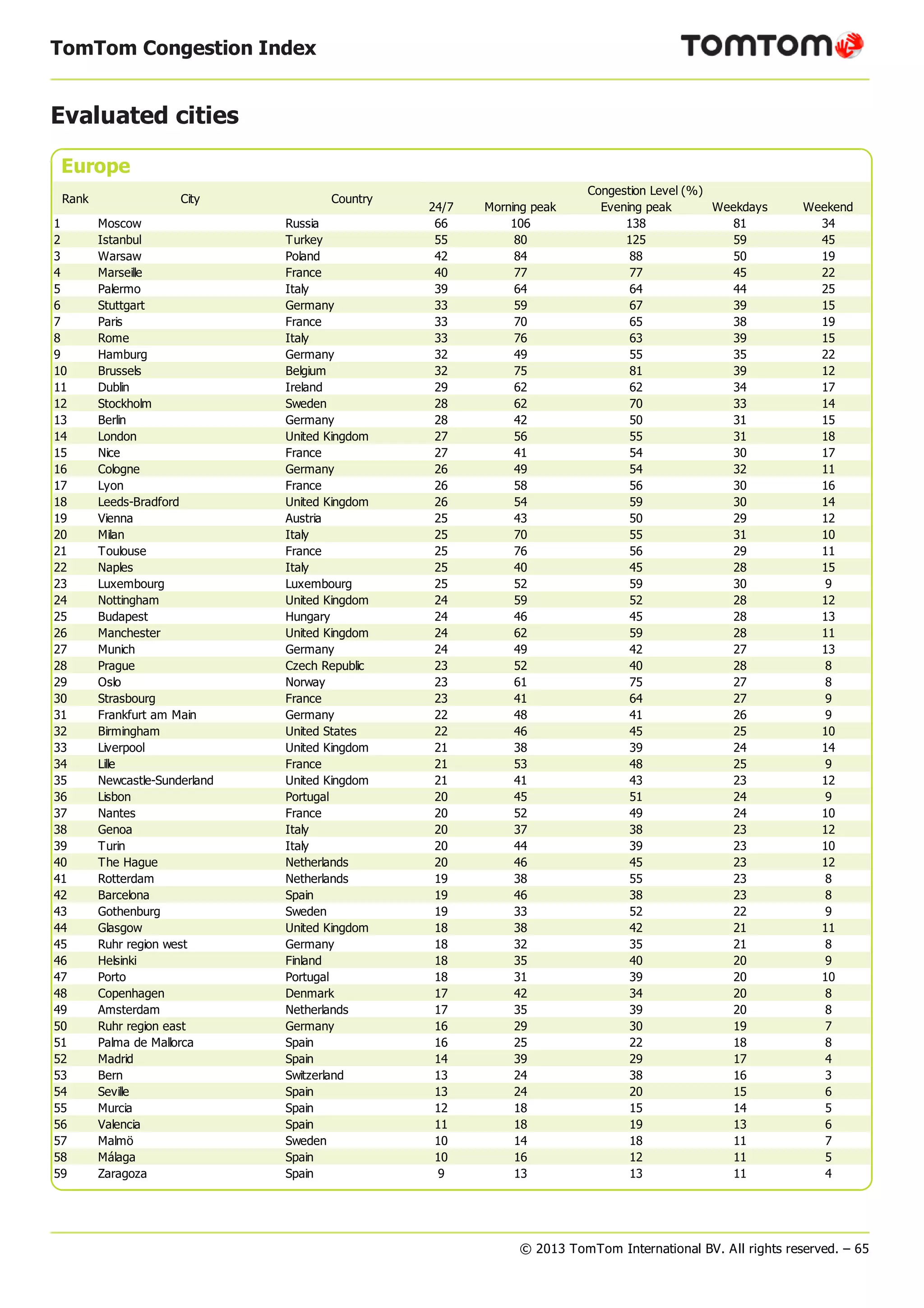 The document presents congestion level data for 59 European cities ranked from most congested to least. Moscow, Russia has the highest overall congestion level at 66% and experiences 106% more congestion during morning peaks. Malaga, Spain has the lowest congestion level at 10% and experiences 16% more congestion during morning peaks. The data includes congestion levels for morning peaks, evening peaks, weekdays, and weekends.