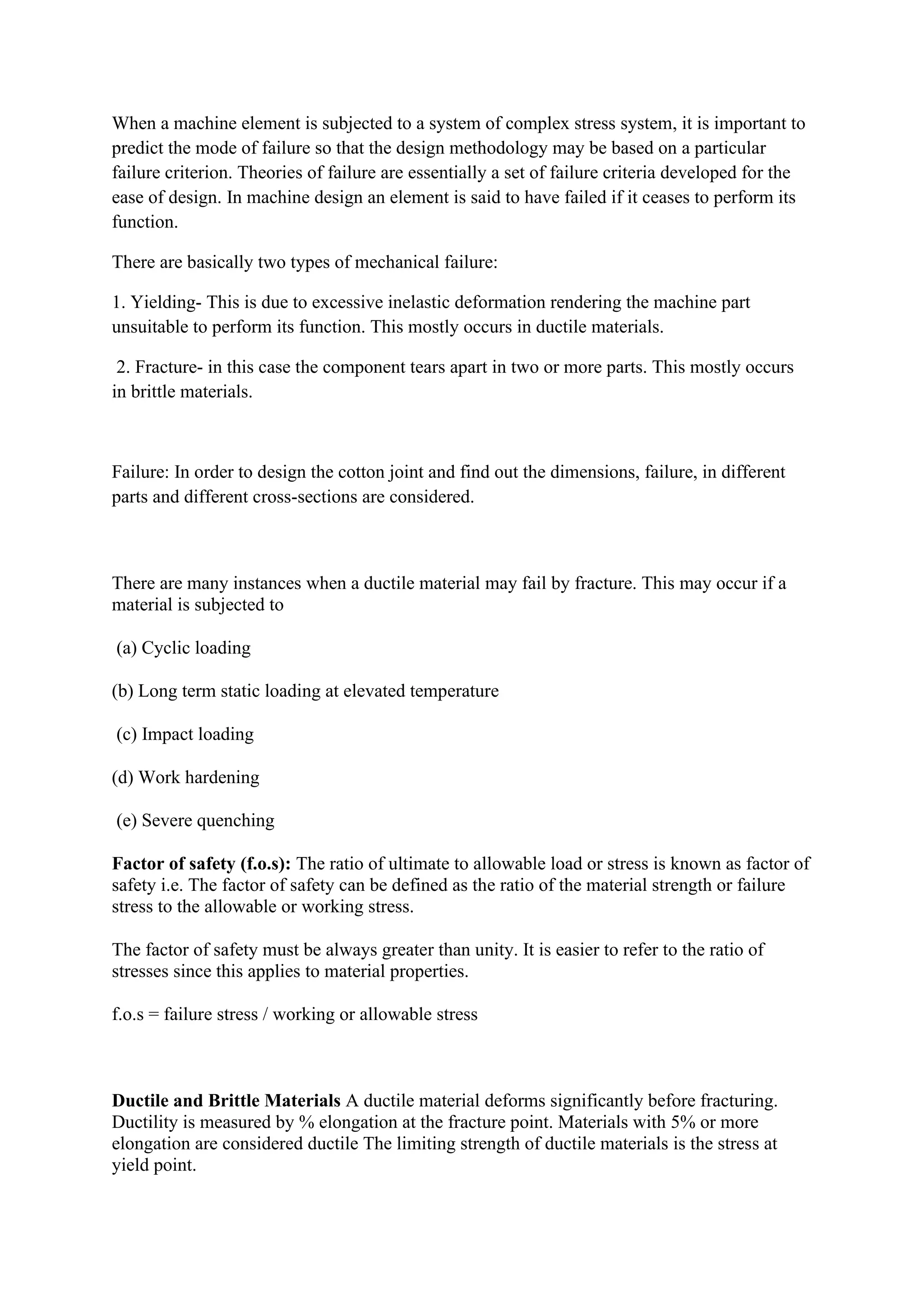 This document discusses various topics related to mechanical design including types of loads and stresses, theories of failure, stress concentration, fatigue, creep, and design of cotter joints. It defines stress and strain, describes different types of loading and the resulting stresses. It discusses various theories of failure for predicting failure under different stress conditions. It also covers stress concentration, factors affecting it, and methods to reduce it. Fatigue behavior is described using S-N curves and endurance limits. Creep behavior and different creep stages are outlined. Design of cotter joints is explained focusing on its components and advantages.