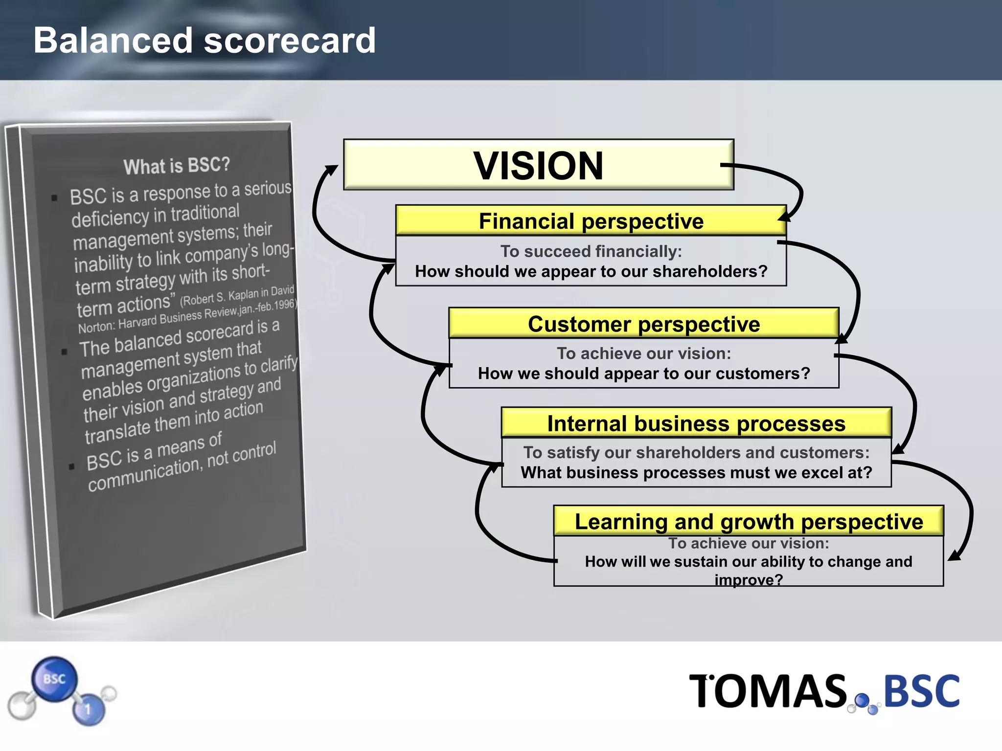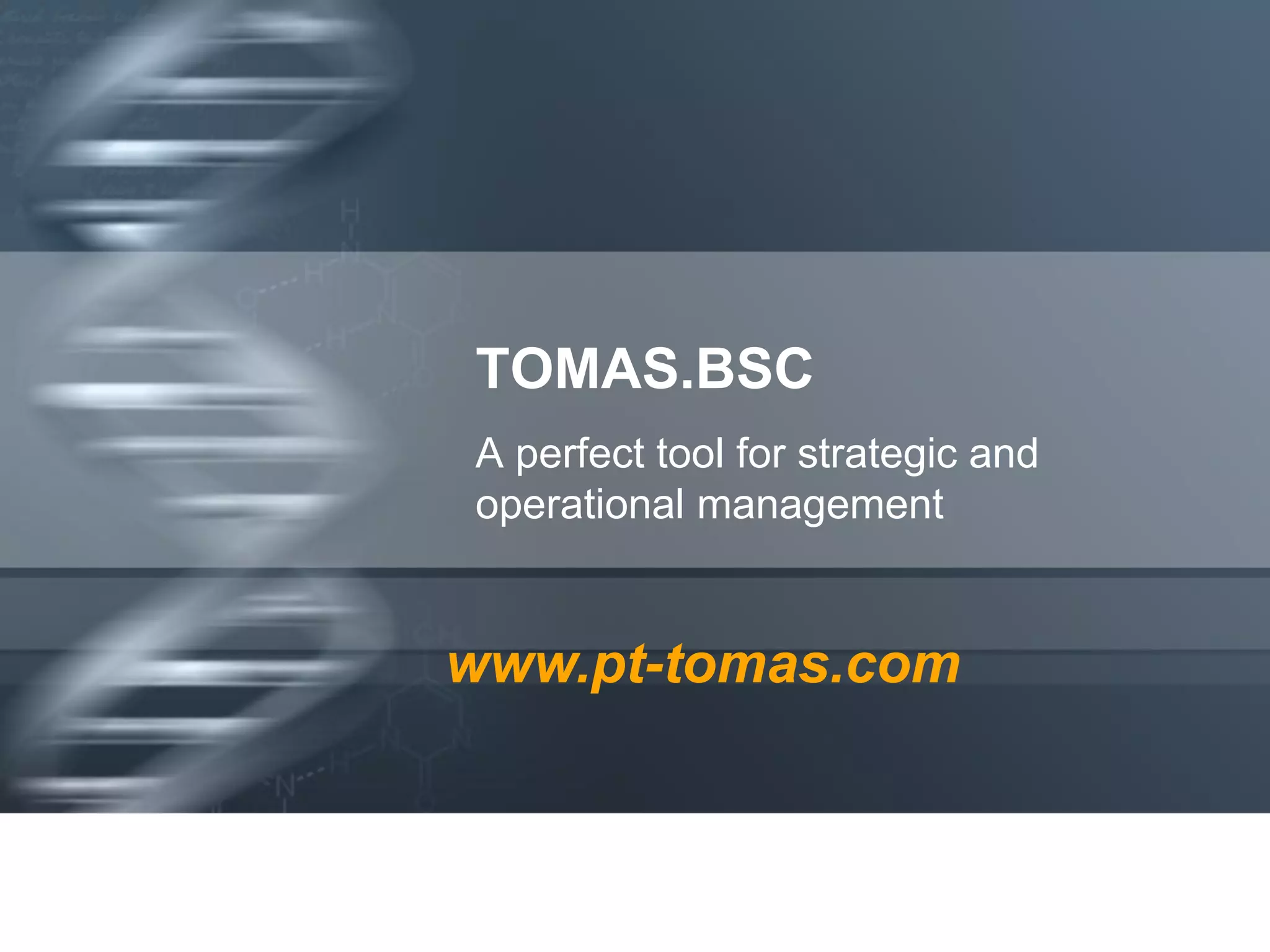 This document summarizes a tool called TOMAS.BSC that provides strategic and operational management through a balanced scorecard approach. It allows users to define visions, perspectives, strategies and key performance indicators to measure strategic goals. The tool provides dashboards, detailed analysis, and automated reporting to monitor performance and ensure continuous improvement.