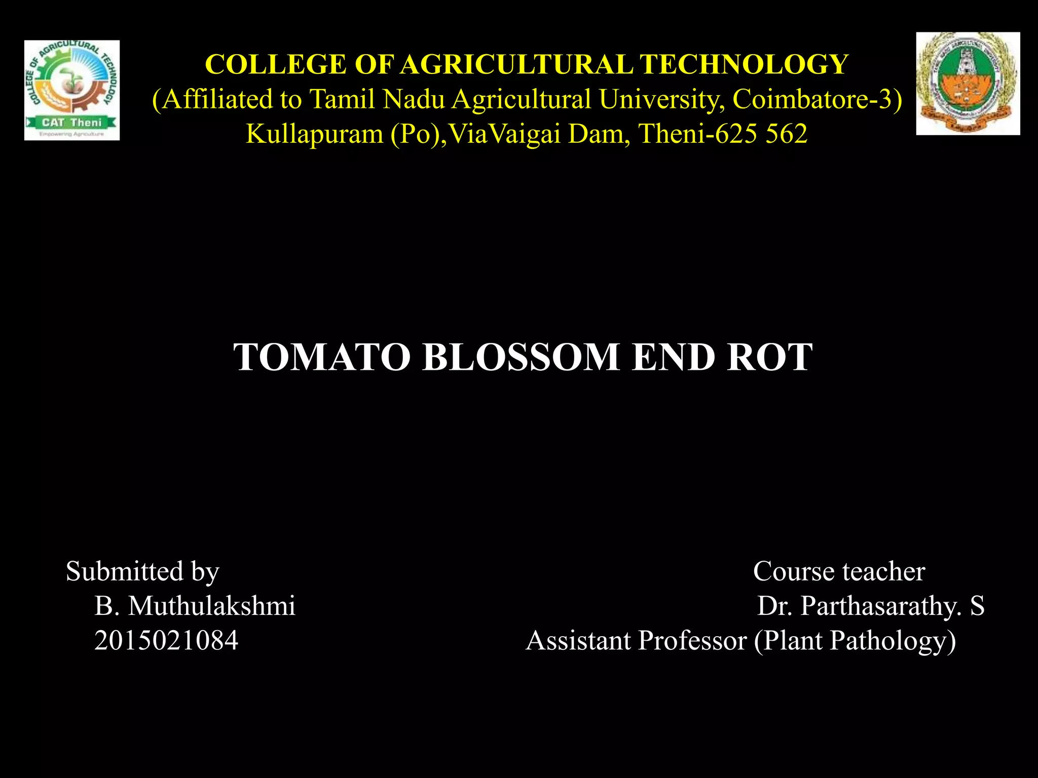 Blossom end rot is a physiological disorder of tomato fruits caused by a calcium deficiency during early fruit development. It causes brown or black, sunken lesions on the blossom end of tomatoes. Blossom end rot can be caused by drought or excessive rainfall during flowering and early fruit development, which inhibits calcium uptake. Management strategies include maintaining uniform soil moisture, using nitrate forms of nitrogen fertilizer, liming to increase soil calcium levels, and applying calcium chloride sprays to foliage if blossom end rot symptoms appear.