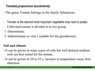 The document discusses the economics of greenhouse tomato production, detailing growth conditions, plant stages, and agricultural practices. It outlines costs associated with land preparation, seedling acquisition, fertilizers, and labor, culminating in an investment summary and estimated profits. The cultivation process highlights the importance of selection, training, pollination, and fertigation for maximizing yields.