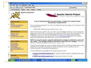 This document provides an overview and instructions for setting up Tomcat and developing servlets on CDF. It discusses Tomcat architecture and components, how to install and run Tomcat locally, how to compile and run a simple "Hello World" servlet example, and how to configure the Sysdeo Eclipse plugin to develop servlets within the Eclipse IDE using Tomcat.