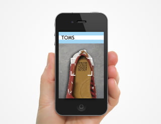 The document discusses ways for TOMS, a company that provides shoes to people in need through a one-for-one model, to inspire continued generosity from customers and strengthen its cause. It explores using mobile technologies like barcode scanning to allow customers to follow the journey of the shoes they helped provide and see the impact of their contribution. This could offer an personalized experience that provides instant gratification and encourages repeat purchases and giving.