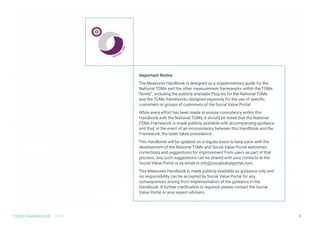 The TOMS Measures Handbook 2021 serves as a supplemental guide for the national TOMS framework, emphasizing the importance of adherence to its principles for measuring social value. It aims to simplify the complexities of social value measurement while providing detailed guidance on various measures, their application, and the necessary evidence for reporting. Continuous updates are encouraged, and the handbook stresses the significance of good quality data in social value reporting.