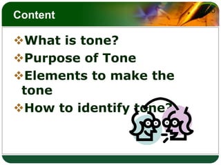 Tone refers to the implied attitude of a writer toward their subject and characters. It can be conveyed through word choices that reveal an author's perspective. Understanding tone is key to comprehending an author's intended meaning and the relationship between the reader and text. Elements like descriptive language, word choice, and details contribute to establishing an overall tone, such as happy, sad, or serious. To identify tone, readers should pay attention to these elements and ask how the author feels about their topic and how those feelings are expressed.