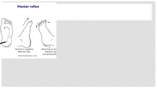 Spasticity, rigidity, hypotonia, dystonia, decerebrate rigidity, and decorticate rigidity are abnormal tones that can occur. Examination of tone includes initial observation, passive and active motion testing using scales like the Modified Ashworth Scale. Typical patterns of spasticity in upper and lower limbs are described for upper motor neuron lesions.
