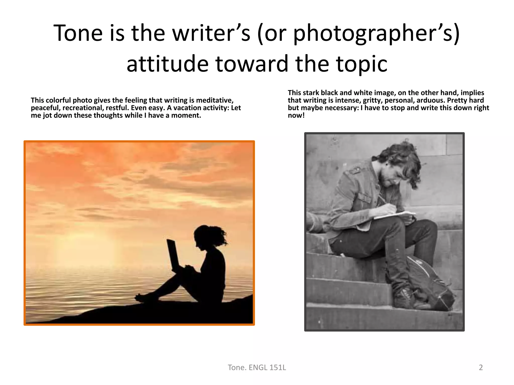 The document discusses the concept of tone in writing and visual media, emphasizing how a writer's attitude towards the topic can influence the reader's perception. It describes the use of various techniques, such as figurative language, style choices, and irony, to convey tone, along with examples from literature and film. Additionally, it poses reflective questions for readers to analyze tone in their own writing and responses.