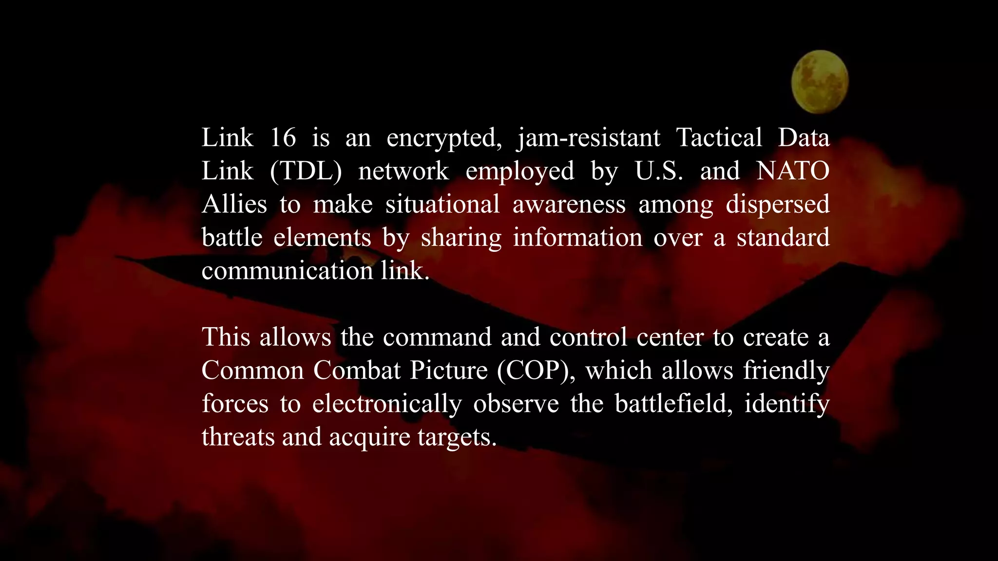Link 16 is a secure, jam-resistant tactical data link network used by U.S. and NATO allies to enhance situational awareness among military forces by sharing information in near real-time. It supports command and control operations for air and missile defense, enabling various military branches to exchange tactical data using satellites for improved connectivity and operational efficiency. Tonex provides comprehensive Link 16 training solutions, covering concepts, security, and network architecture for a wide range of military and defense personnel.