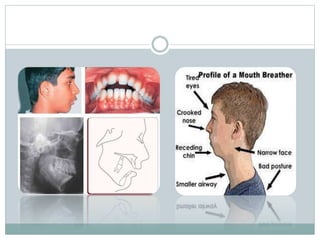 This document summarizes information about tongue thrusting, including its causes, characteristics, classifications, and treatment. Tongue thrusting is when the tongue protrudes through the front teeth during swallowing, speech, and at rest. It is common in children and can be caused by factors like retained infantile swallow reflex, mouth breathing, neurological issues, or feeding practices. Tongue thrusting can lead to malocclusion and is classified in different ways, including by whether it involves anterior or posterior thrusting. Treatment involves training correct swallowing and tongue posture, speech therapy, appliances to guide the tongue, and orthodontics if needed.