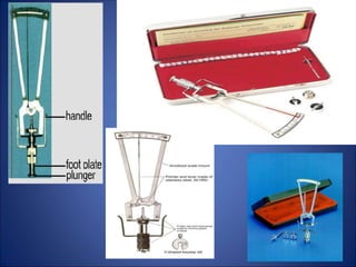 This document discusses different types of tonometers used to measure intraocular pressure. It describes indentation tonometers like the Schiotz tonometer which measures indentation depth from a known weight. Applanation tonometers like the Goldmann tonometer flatten a circular area of the cornea to measure pressure. Non-contact tonometers use an air puff to detect inward and outward corneal movement at different pressures. Accuracy can be affected by corneal properties, accommodation, and proper technique.