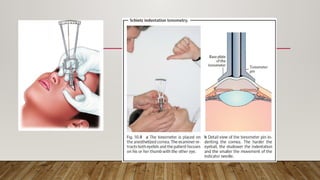 Tonometry is a procedure to measure intraocular pressure (IOP) using various techniques such as indentation, applanation, and non-contact methods. The document details the history, advantages, and limitations of different tonometry devices, including their operation, calibration, and specific applications for diverse corneal conditions. It also discusses potential sources of error and the importance of disinfection between uses to ensure accurate and safe measurements.