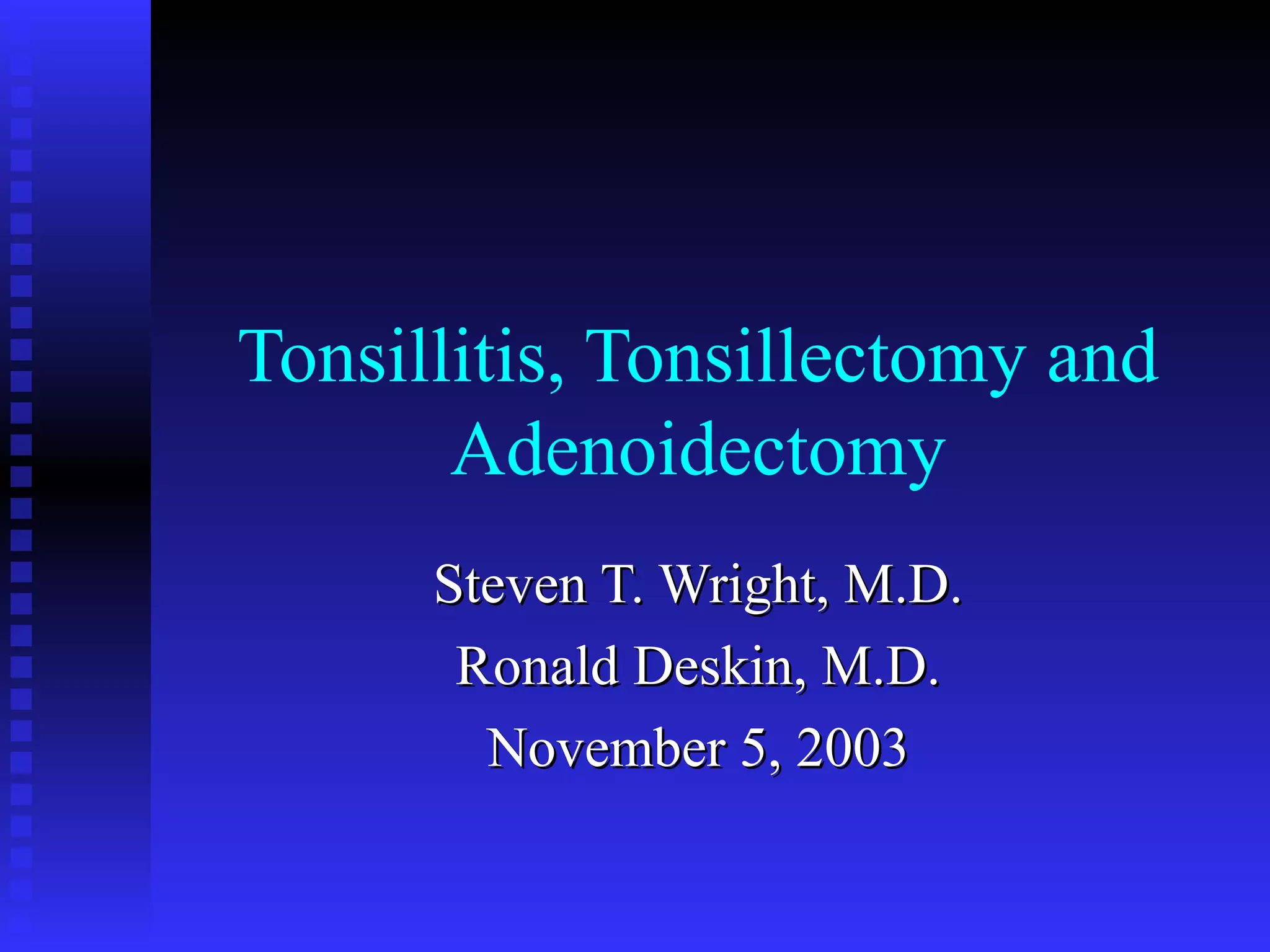 This document discusses tonsillitis, tonsillectomy, and adenoidectomy. It provides details on:
