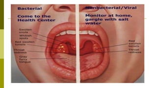 Tonsillitis is inflammation of the palatine tonsils caused by viral or bacterial infection. Common symptoms include sore throat, fever, and tender cervical lymph nodes. Physical examination reveals enlarged, inflamed tonsils that may have exudates. Throat culture is the standard test to detect Group A Streptococcus infection. Treatment involves pain relief, antibiotics if streptococcal infection is confirmed, and tonsillectomy for recurrent or chronic cases.