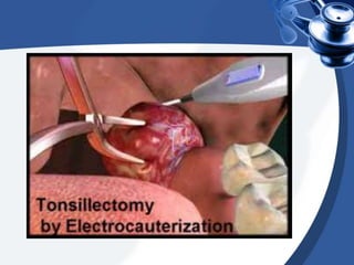 Tonsillectomy is commonly performed to treat recurrent throat infections. Absolute indications for tonsillectomy include recurrent infections, peritonsillar abscesses, tonsillitis causing seizures, tonsil hypertrophy causing obstruction, and suspicion of malignancy. Relative indications include being a carrier of diphtheria or streptococcus. The operation is usually done under general anesthesia with the patient in Rose's position. The tonsils are grasped, dissected from surrounding tissue, and removed using a wire snare. Post-operative care involves pain management, oral hygiene, diet progression, and antibiotics to prevent infection. Potential complications include bleeding, infection, and scarring.