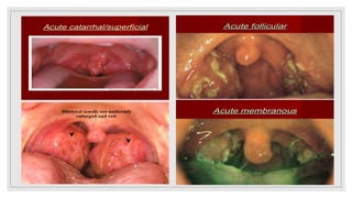 Acute tonsillitis is usually caused by bacteria and viruses infecting the tonsils. It causes sore throat, fever, earache, and enlarged lymph nodes. Examination may reveal spots in the tonsil crypts or white membranes. Rapid strep tests or throat culture can detect bacteria. Treatment involves rest, fluids, analgesics, and antibiotics like penicillin. Complications can include abscesses, rheumatic fever, or kidney problems. Chronic tonsillitis results from untreated acute infections and causes recurrent sore throats, bad breath, and difficulty swallowing. Treatment may involve antibiotics or tonsillectomy to prevent complications.