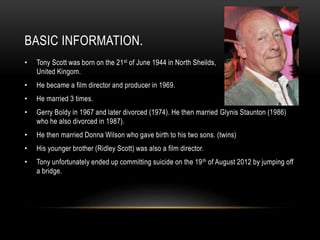 The document provides biographical information about British film director Tony Scott and summarizes two of his films, Déjà Vu and Unstoppable. It notes that Tony Scott began his career in film in 1969 and directed many successful action and thriller movies. It describes the basic plots and production details of Déjà Vu, starring Denzel Washington, and Unstoppable, starring Denzel Washington and Chris Pine. Both films involve dangerous situations involving transportation that must be stopped or prevented and have elements common to thriller genres like fast pacing, dark tones, and unanswered questions.