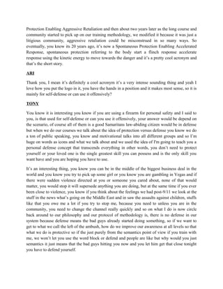 The document discusses Tony Blauer and his self-defense system called SPEAR (Spontaneous Protection Enabling Accelerated Response). Tony explains how SPEAR originated from a military combat stance and tactic. He describes how the acronym SPEAR was developed to represent the phases of the body's response to danger: spontaneous protection, enabling aggressive retaliation. Tony emphasizes increasing awareness over physical defense techniques to avoid dangerous situations.