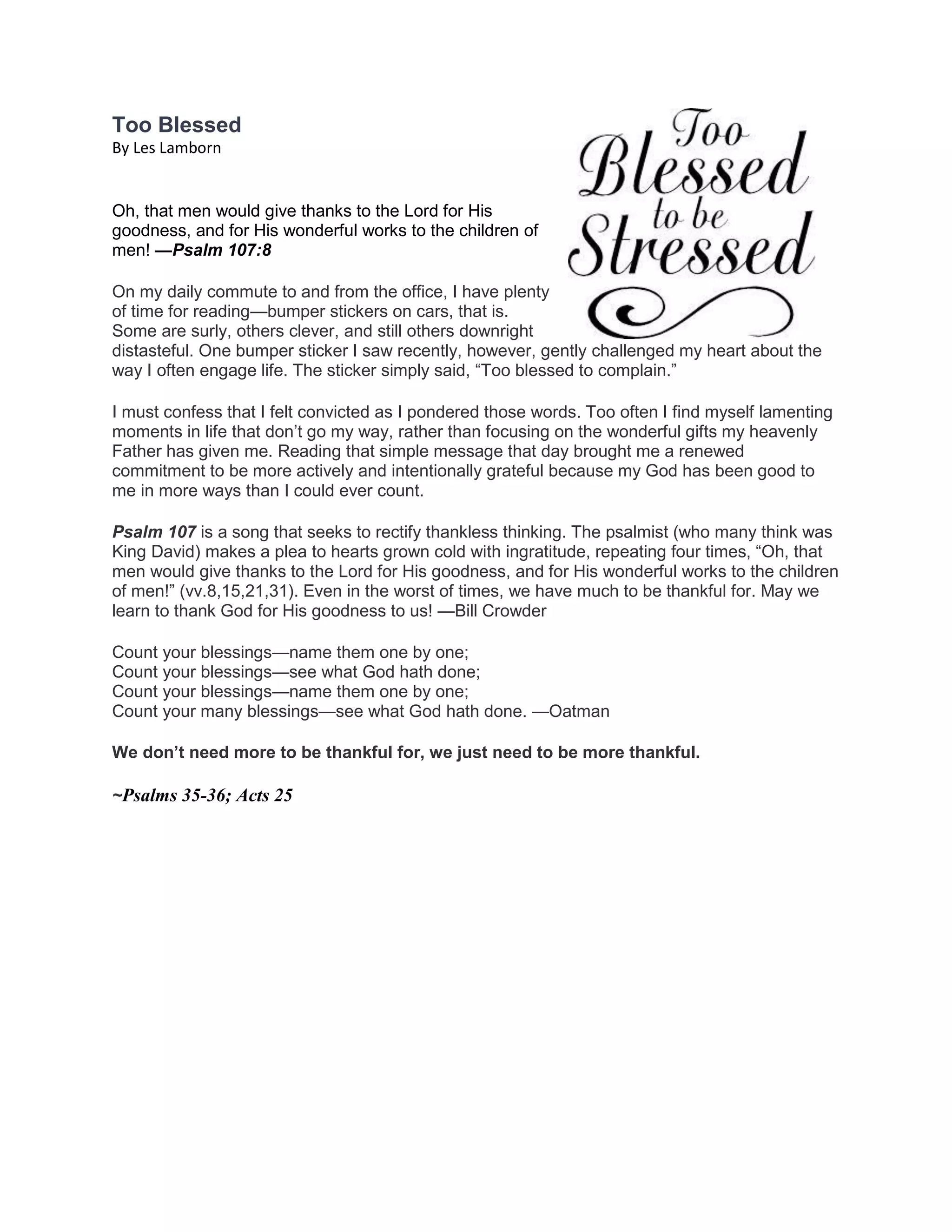 The author sees a bumper sticker that says "Too blessed to complain" while commuting to work one day. This bumper sticker convicts the author about how often they find themselves complaining rather than being grateful for the gifts God has given them. The passage from Psalm 107 encourages giving thanks to God for his goodness and wonderful works. Even in difficult times, there is much to be thankful for. The author is reminded to learn thanking God for his goodness.