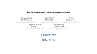 The document discusses a novel task-aligned one-stage object detection method called Tood, which aims to improve the performance of object detection by aligning classification and localization tasks through a specialized framework. It introduces task-aligned heads and learning mechanisms, resulting in superior detection accuracy compared to existing methods. Experiments demonstrate Tood's effectiveness using the COCO 2017 dataset, achieving significant advancements over the state-of-the-art models.
