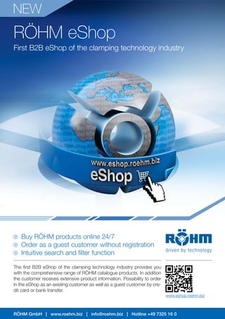 The Röhm eShop is the first B2B platform in the clamping technology industry, offering a wide range of Röhm products with extensive product information, available for order 24/7. It features an intuitive search and filter function, allowing customers to place orders as guest or registered users via credit card or bank transfer. The document also highlights various tool clamping systems and their specific applications, including automatic and manual clamping sets suitable for different machining speeds.