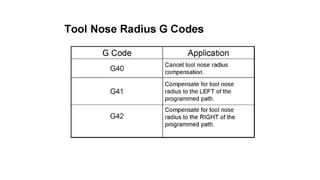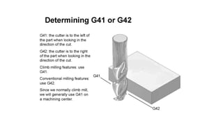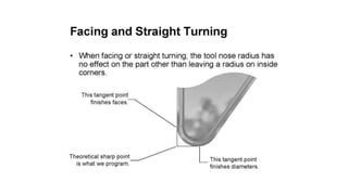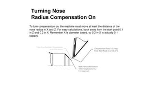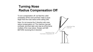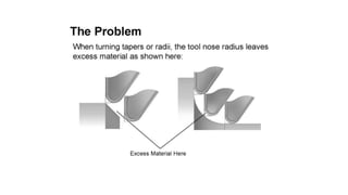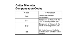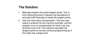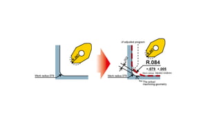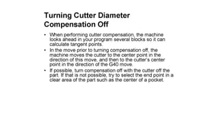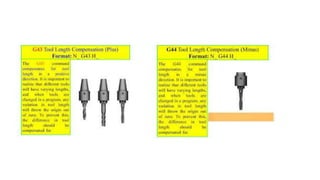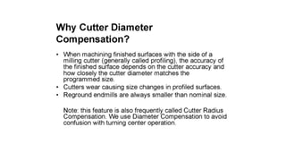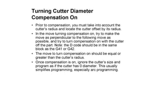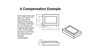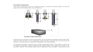 The document discusses tool compensation in machining, emphasizing its importance for manufacturing accurate parts and reducing dimensional errors. It covers various types of tool compensation, such as cutter radius, tool nose radius, and tool length compensation, while detailing the process of calculating tool length compensation using G codes. Additionally, it introduces touch-trigger probes (TTPs) in CNC turning for on-machine measurement and automatic tool compensation, highlighting their operational principles and factors affecting their performance.