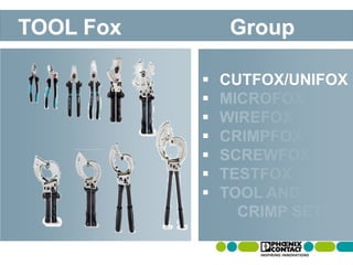 The document provides an overview of various tools offered by the Tool Fox Group, highlighting cutting, crimping, stripping, and universal tools, all designed for ergonomic use and efficient application. It lists specific models with their capabilities, features, and intended use cases, such as the Cutfox series for cutting cables, the Wirefox for stripping, and the Crimpfox for crimping connectors. Additionally, it mentions accessory kits and tool sets designed for organization and ease of use in various electrical tasks.