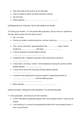 This document contains a questionnaire to help students plan their future by identifying their talents, strengths, weaknesses, and considering suggestions from others. The questionnaire contains questions about students' contact with the workforce, expectations after graduating high school or college, satisfaction with post-graduation activities and choices, and what type of support would help them define goals and careers. It is targeted at students between 14-19 years old to help guide them as they consider their future education and career paths.