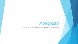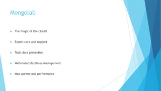 Mongolab is a cloud-based database management platform that provides free and paid plans for MongoDB hosting and management. It offers features like web-based management tools, 24/7 monitoring, backups, and support. For free users it provides 496MB of storage and daily automated backups. Paid plans provide more storage and custom backup schedules. The interface makes it easy to set up databases, manage collections and users, import/export data, and view backups. However, one-time backups require a paid plan. Overall the review found Mongolab to be a friendly tool for managing MongoDB databases in the cloud.