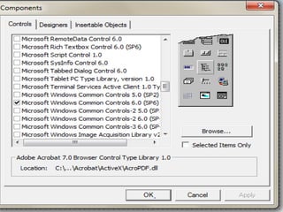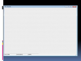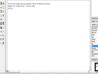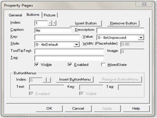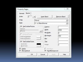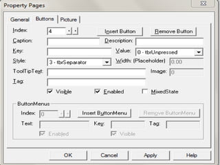 The document discusses different toolbar controls in Visual Basic - toolbars, status bars, and coolbars. It provides steps for adding each control to a form and customizing their appearance and functionality. For toolbars, this includes adding buttons, handling button clicks, adding separators and images. For status bars, it covers adding panels and displaying text. For coolbars, it outlines adding controls to the bands.