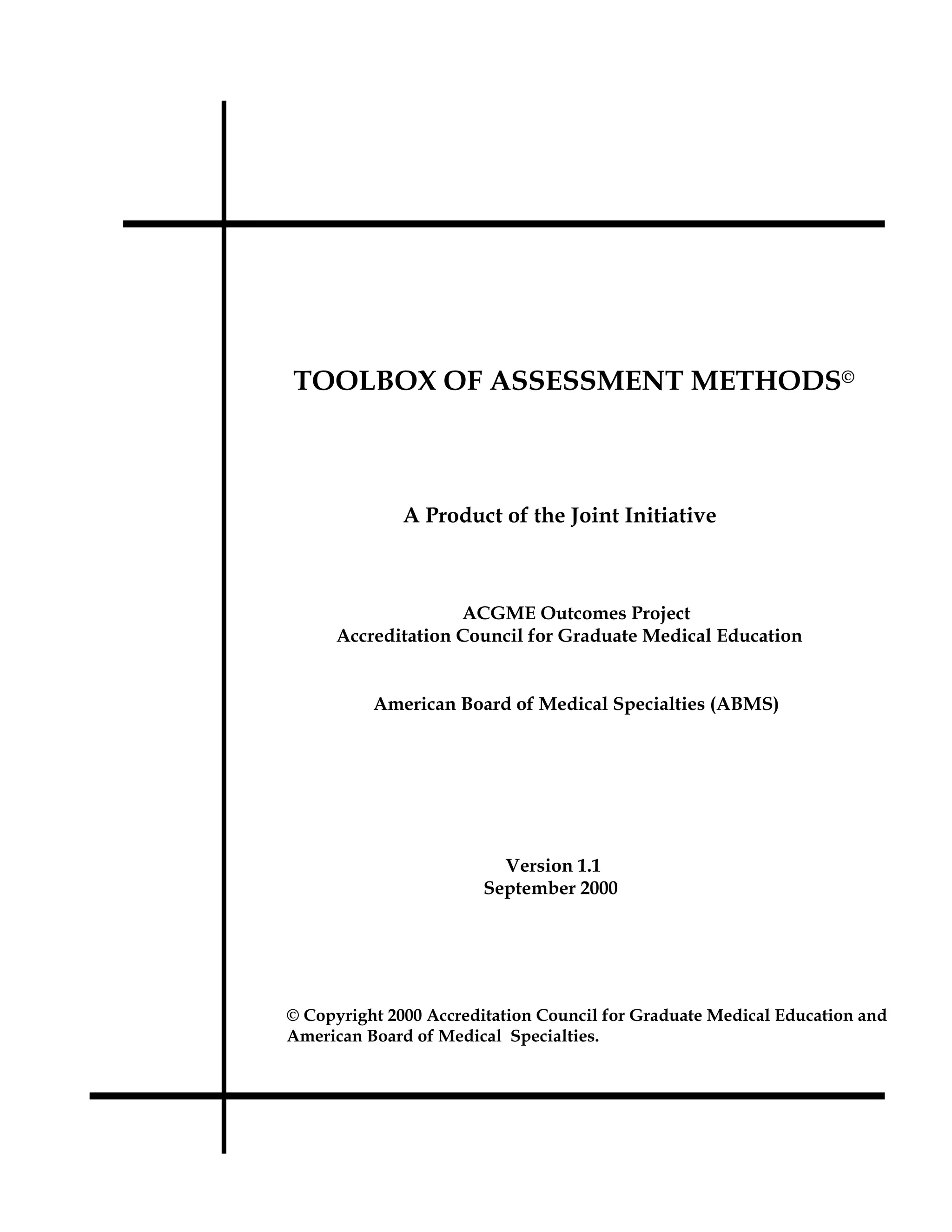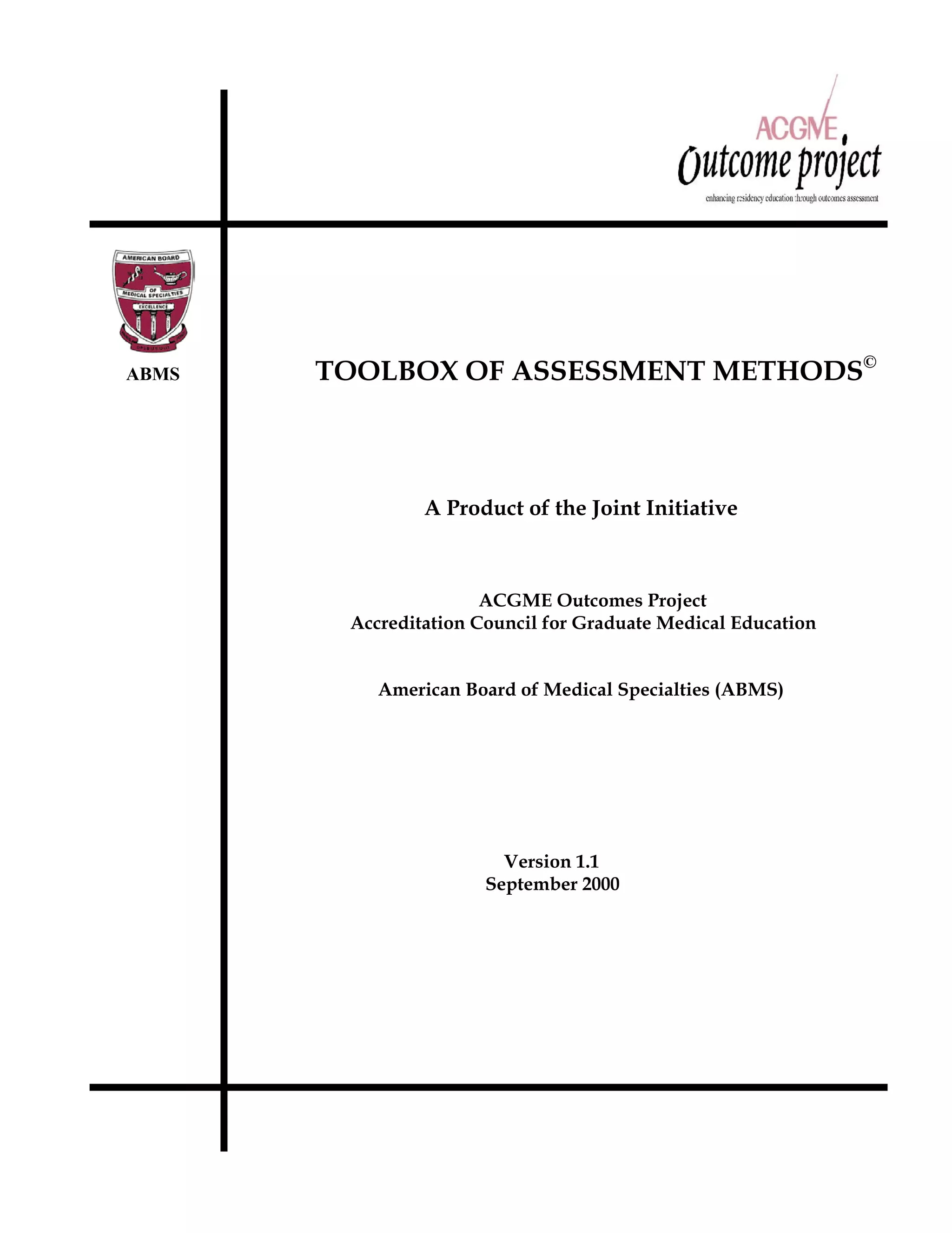 This document provides information about the Toolbox of Assessment Methods, which was created through a joint initiative between the Accreditation Council for Graduate Medical Education (ACGME) and the American Board of Medical Specialties (ABMS). It describes various assessment methods that can be used to evaluate residents, including brief descriptions of each method, how they are used, their psychometric qualities, and feasibility. The toolbox is intended to assist medical educators in selecting and developing evaluation techniques for residency programs and assessing resident competencies.