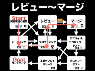 ! 開発環境の構築 レビューマージ デプロイ & デベロッパー テスト カスタマー テスト ! プログラミング 本番デプロイ ミーティング モニタリングリリース