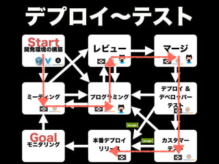 開発環境の構築 レビューマージ デプロイ & デベロッパー テスト カスタマー テスト ! プログラミング 本番デプロイ ミーティング Goal モニタリングリリース