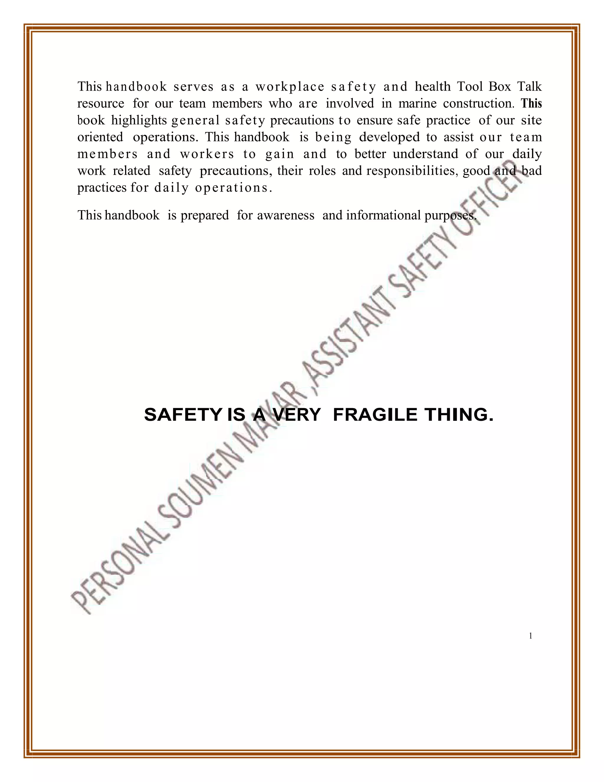 This handbook serves as a comprehensive safety and health resource for marine construction teams, detailing essential safety precautions and practices. It covers a wide array of topics, including cold-related safety, driver safety, hearing protection, electrical hazards, and proper equipment usage. The aim is to inform team members about their responsibilities and promote a safer working environment through awareness and training.