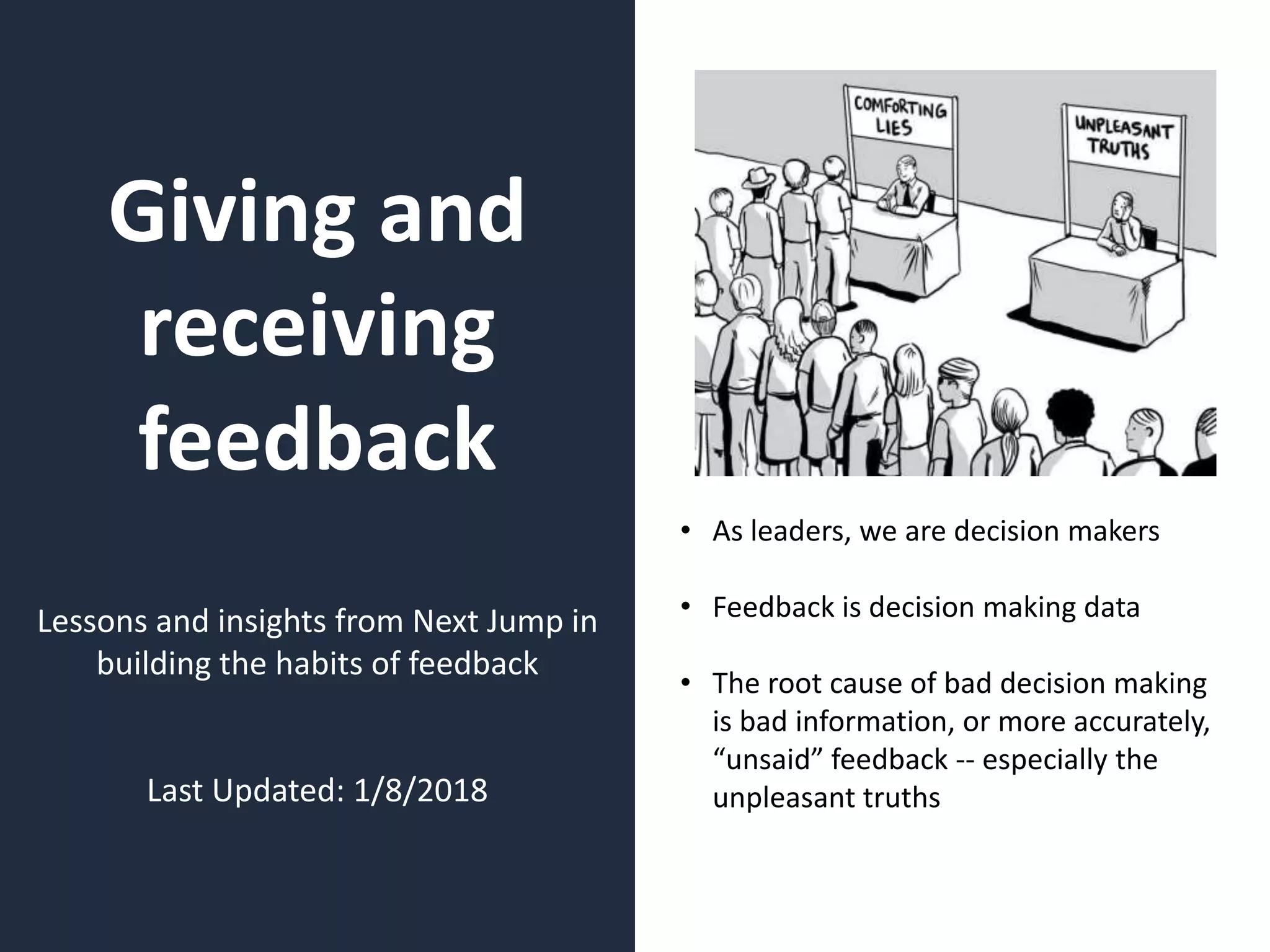 The document outlines the significance of giving and receiving feedback as a critical factor in effective decision-making and team performance. It emphasizes the importance of candid feedback through practice, the use of a feedback app for better engagement, and strategies for both giving and receiving feedback constructively. The text advocates for creating a culture where feedback is normalized and utilized for continuous improvement, calling it 'investment in loss' as individuals develop new habits.