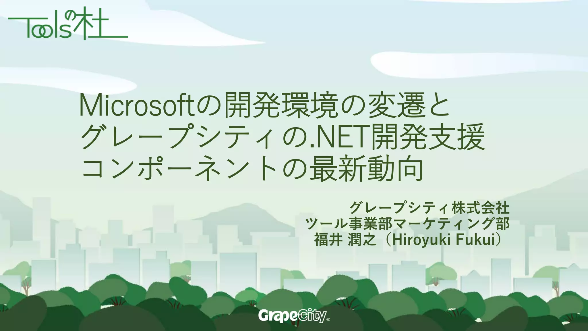 2018年7月10日開催 グレープシティ 開発支援ツール30周年記念フォーラム「Toolsの杜(ツールのもり)」のランチセッション「Microsoftの開発環境の変遷とグレープシティの.NET開発支援コンポーネントの最新動向/グレープシティ 福井潤之」の資料です。