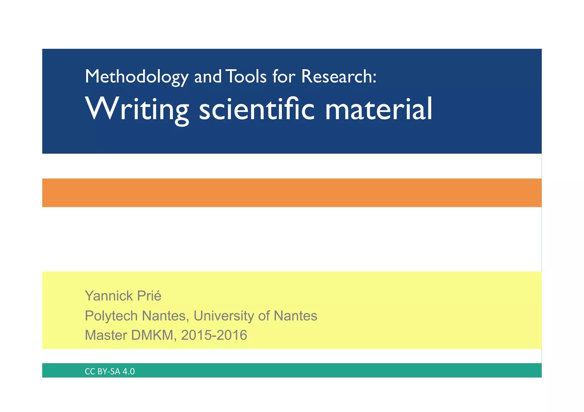 This document provides an overview of methodology and tools for writing scientific material. It discusses key elements of research papers such as the introduction, body, conclusion and references. The introduction should present the problem, motivation and contributions. The body should substantiate the claims, provide definitions, theorems and related work. Experimental work requires clear methodology, results and discussion of implications. Figures and tables must be clearly presented and cited. The conclusion summarizes key ideas and can discuss future work. References are included within the text and at the end in the appropriate style. Acknowledgments recognize funding and contributions.