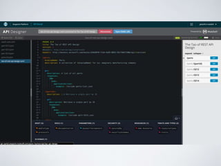 The document discusses various tools and techniques for API design, management, and testing, highlighting multiple API specification formats such as Swagger, RAML, and Blueprint. It covers the historical adoption and current state of these specifications, alongside trends in debugging, analytics, and testing methodologies. Additionally, it emphasizes the importance of measuring API performance and developer experience metrics, alongside the role of API management vendors in providing essential services.