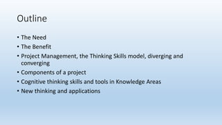 This document provides an overview of tools and techniques used in project management. It begins with outlining the need for 21st century skills like creativity, problem solving, and collaboration in business reports and project management. It then covers the components that make up a project, including the five process groups, ten knowledge areas, and 49 processes. A large portion of the document focuses on cognitive thinking skills and specific tools that can be used within each of the knowledge areas. These include techniques like brainwriting for scope management and SWOT analysis for risk identification. Finally, it discusses the importance of both divergent and convergent thinking for project managers and provides examples of when each type would be needed.