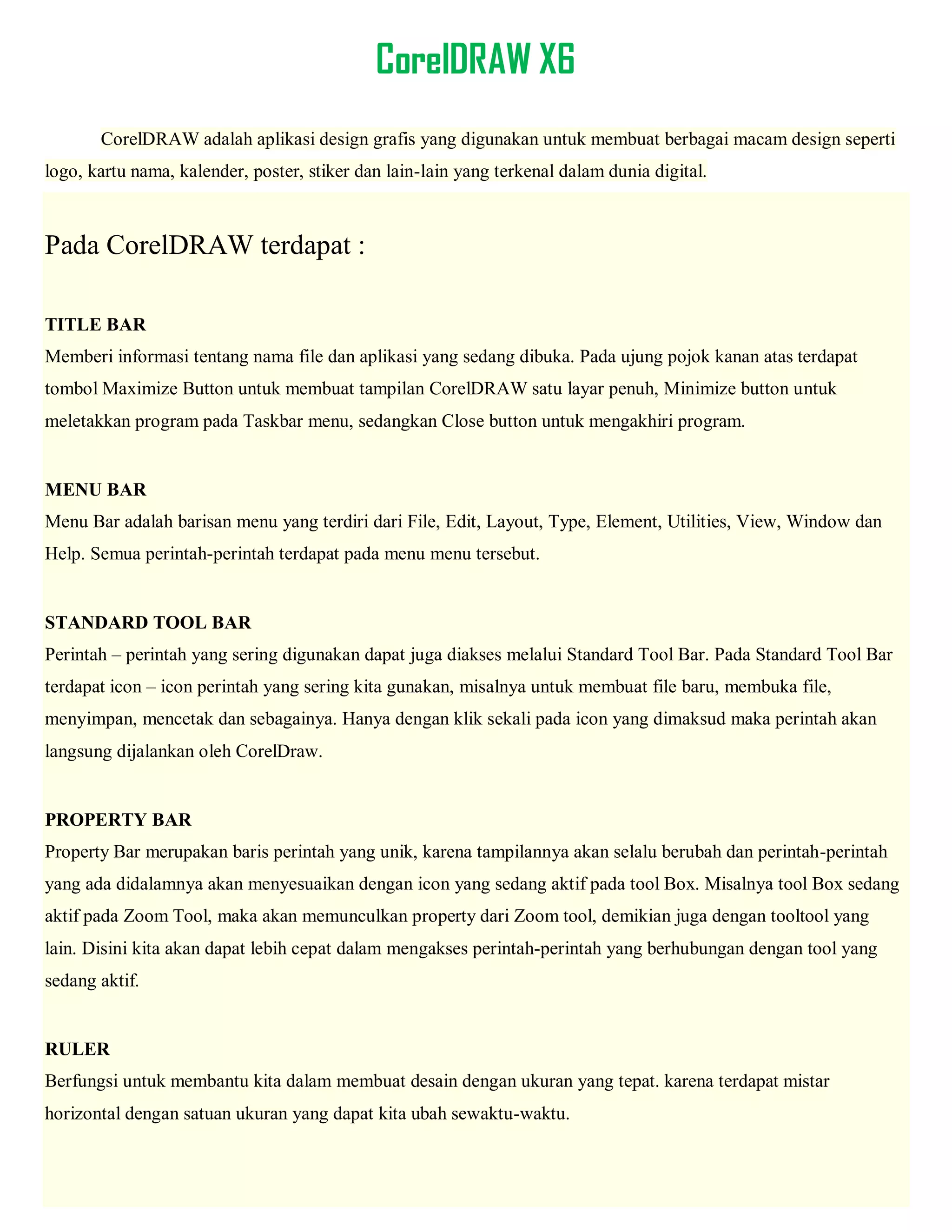 CorelDRAW X6 adalah perangkat lunak desain grafis yang memungkinkan pengguna untuk membuat berbagai jenis desain seperti logo dan poster. Aplikasi ini dilengkapi dengan berbagai alat dan fitur seperti menu bar, tool box, dan property bar yang memfasilitasi manipulasi objek dan pengaturan warna. CorelDRAW juga menawarkan akses cepat melalui toolbar dan shortcut untuk meningkatkan efisiensi dalam proses desain.