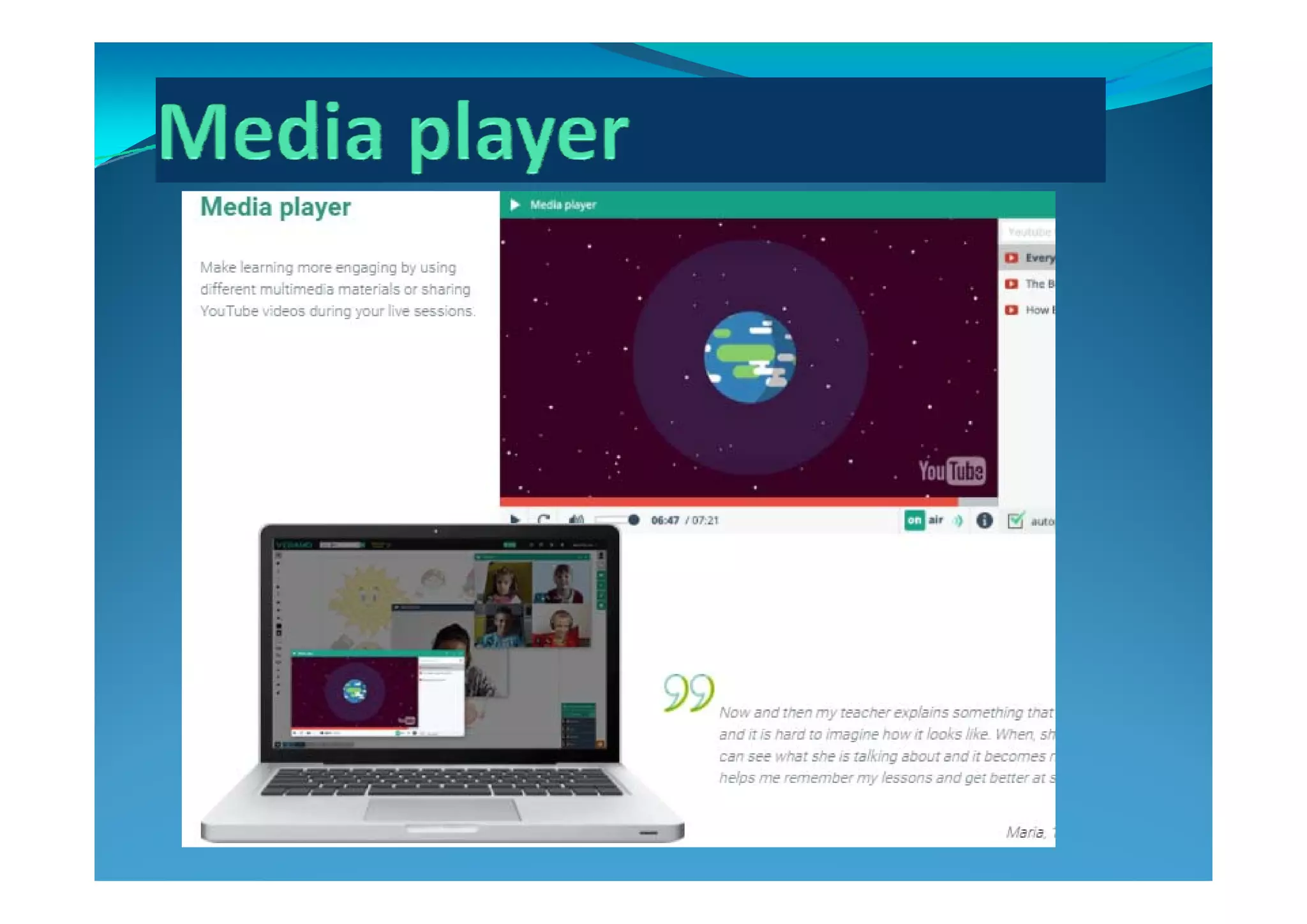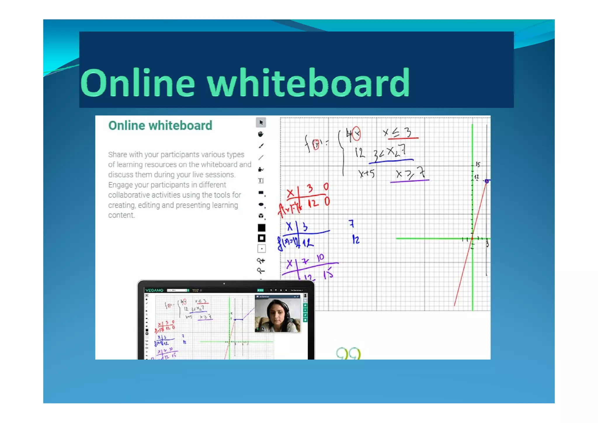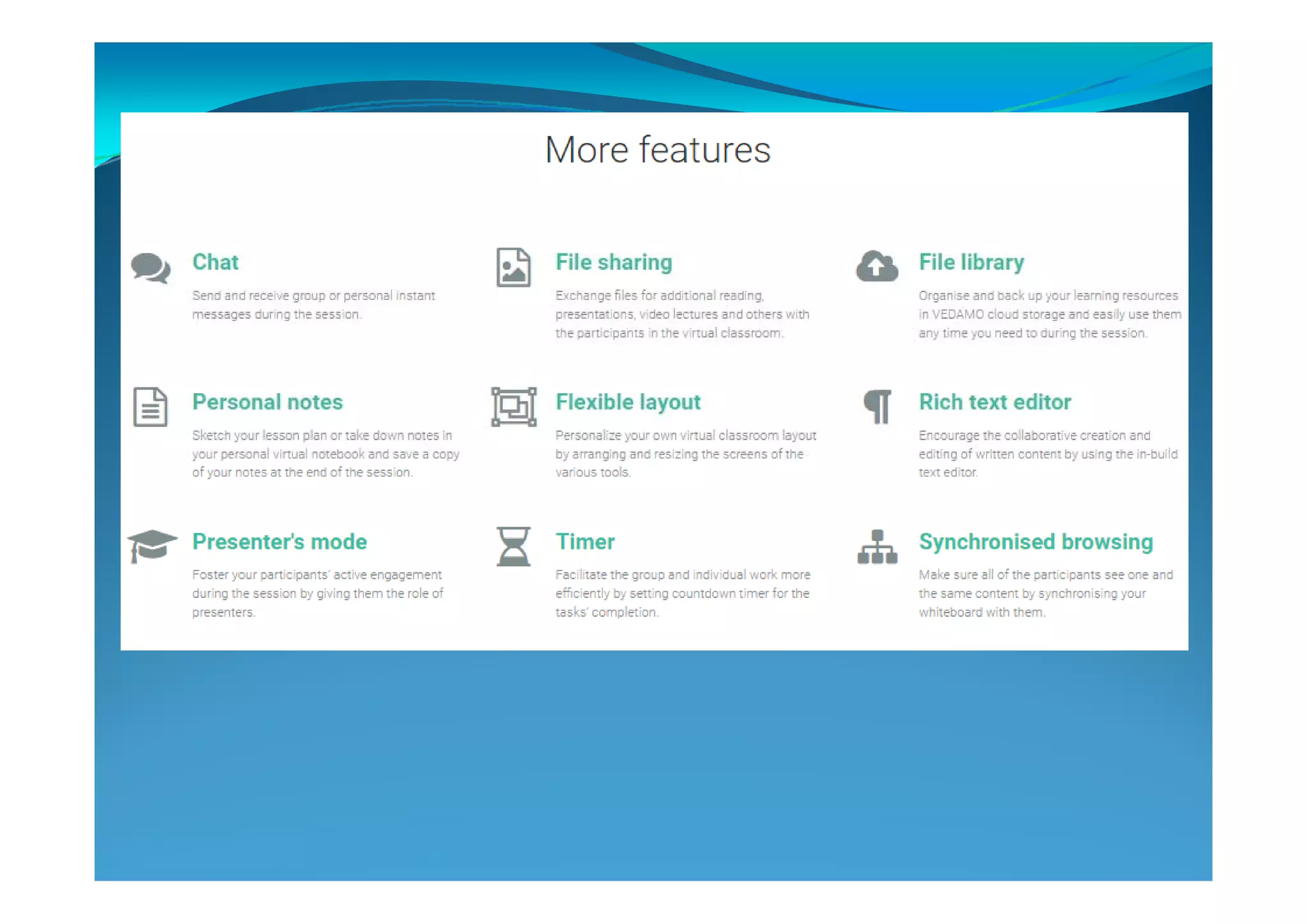Highlights various interactive tools available in the virtual classroom, enhancing teaching and learning.