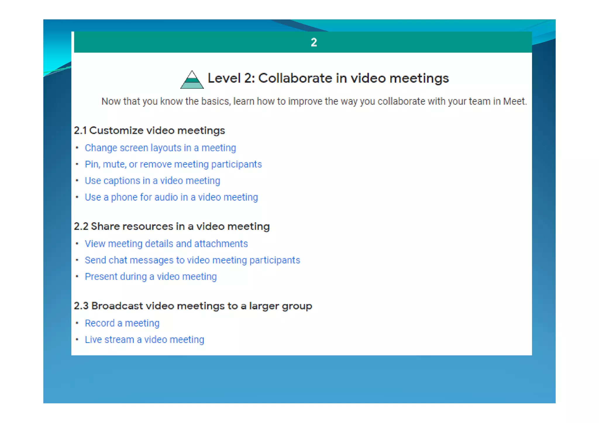 Explains the features of online learning environments such as shared spaces, video conferencing, and collaboration tools.