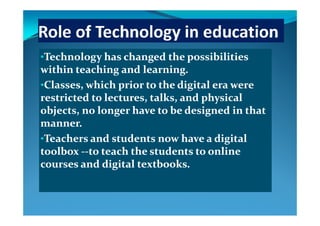 The document discusses the impact of technology on teaching and learning, emphasizing the transition from traditional methods to digital tools for education. It highlights various online education formats such as live sessions, webinars, and interactive virtual classrooms, detailing the necessary tools and requirements for effective online teaching. Additionally, it stresses the importance of active participation, engagement, and a well-structured approach to enhance the learning experience in a virtual environment.