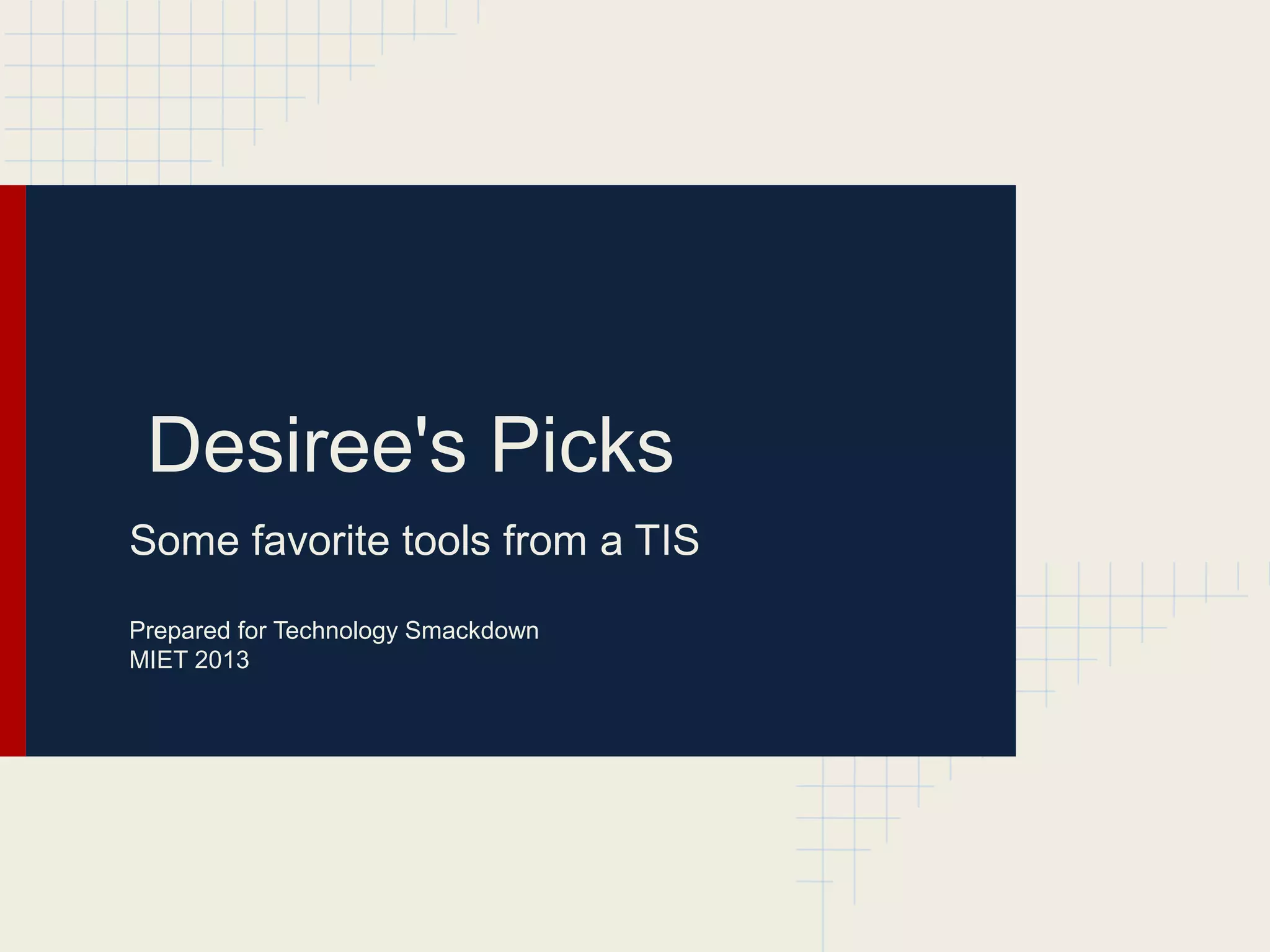 The document outlines Desiree's favorite educational technology tools from the 2013 Technology Smackdown, including collaboration platforms like Google Hangout and Edmodo, and various audio recording tools such as SoundCloud and Audioboo. Each tool is praised for features that facilitate secure connections, easy access, and interactive learning environments. Additionally, bookmarking tools like Symbaloo and Diigo are highlighted for their utility in organizing online resources.