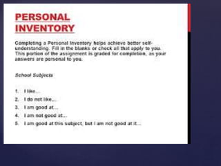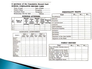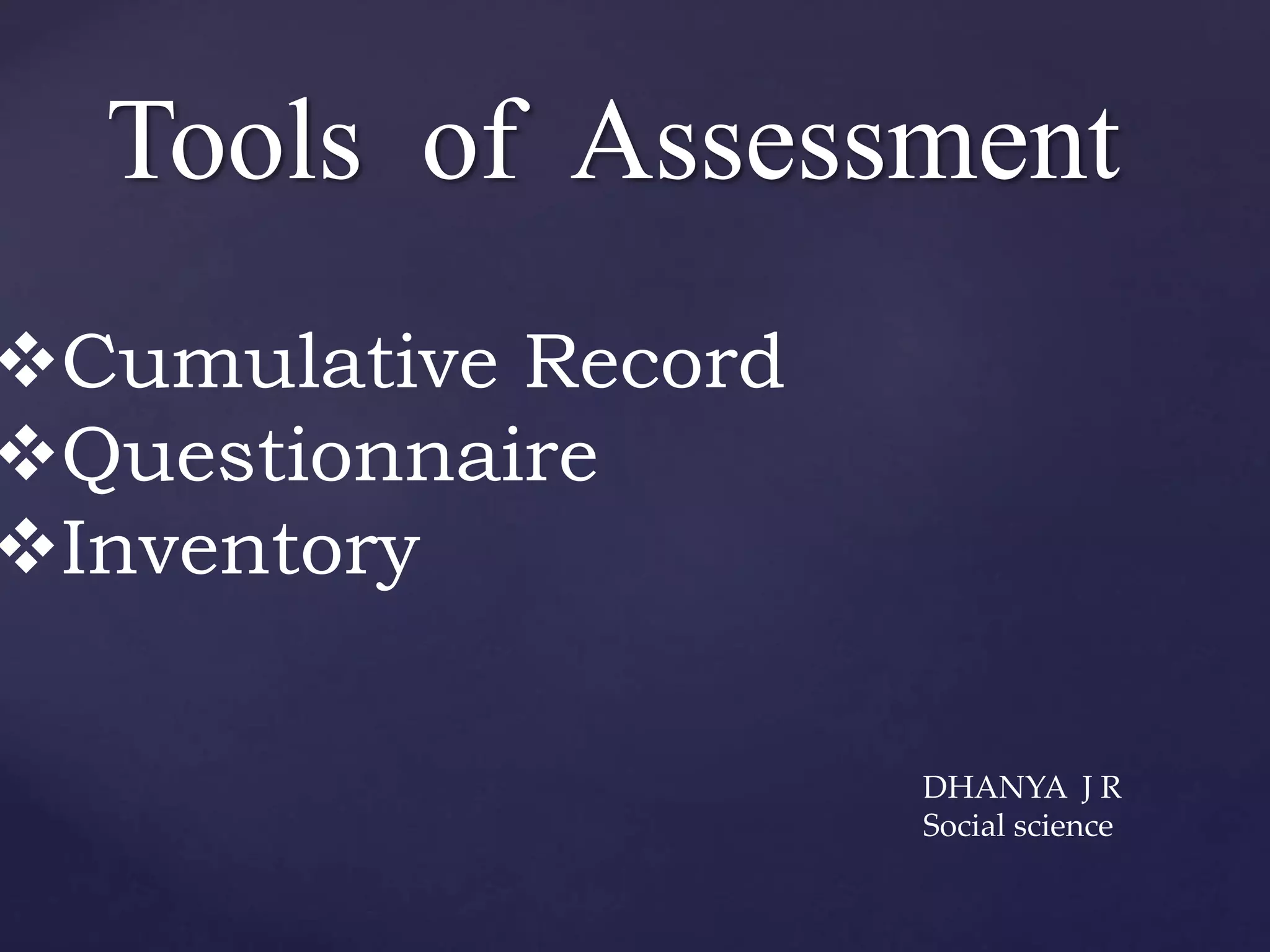 The document discusses three tools of assessment: the cumulative record, questionnaire, and inventory. The cumulative record contains a student's academic results and progress over time. A questionnaire is a form for collecting answers to questions from many respondents efficiently. An inventory is a self-reported survey or questionnaire, often about personal characteristics, that collects subjective information without right or wrong answers.