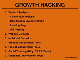This document provides an overview of growth hacking techniques and tools. It discusses product analysis using conversion analysis, heat maps, landing pages, and A/B testing. It also covers tracking website behavior and individual behavior. Additionally, it outlines acquisition tools like SEM, content marketing, and exit intent. The document concludes with examples of growth hacks and a case study on how tools were used to analyze data and run experiments for a company called Skillfeed.
